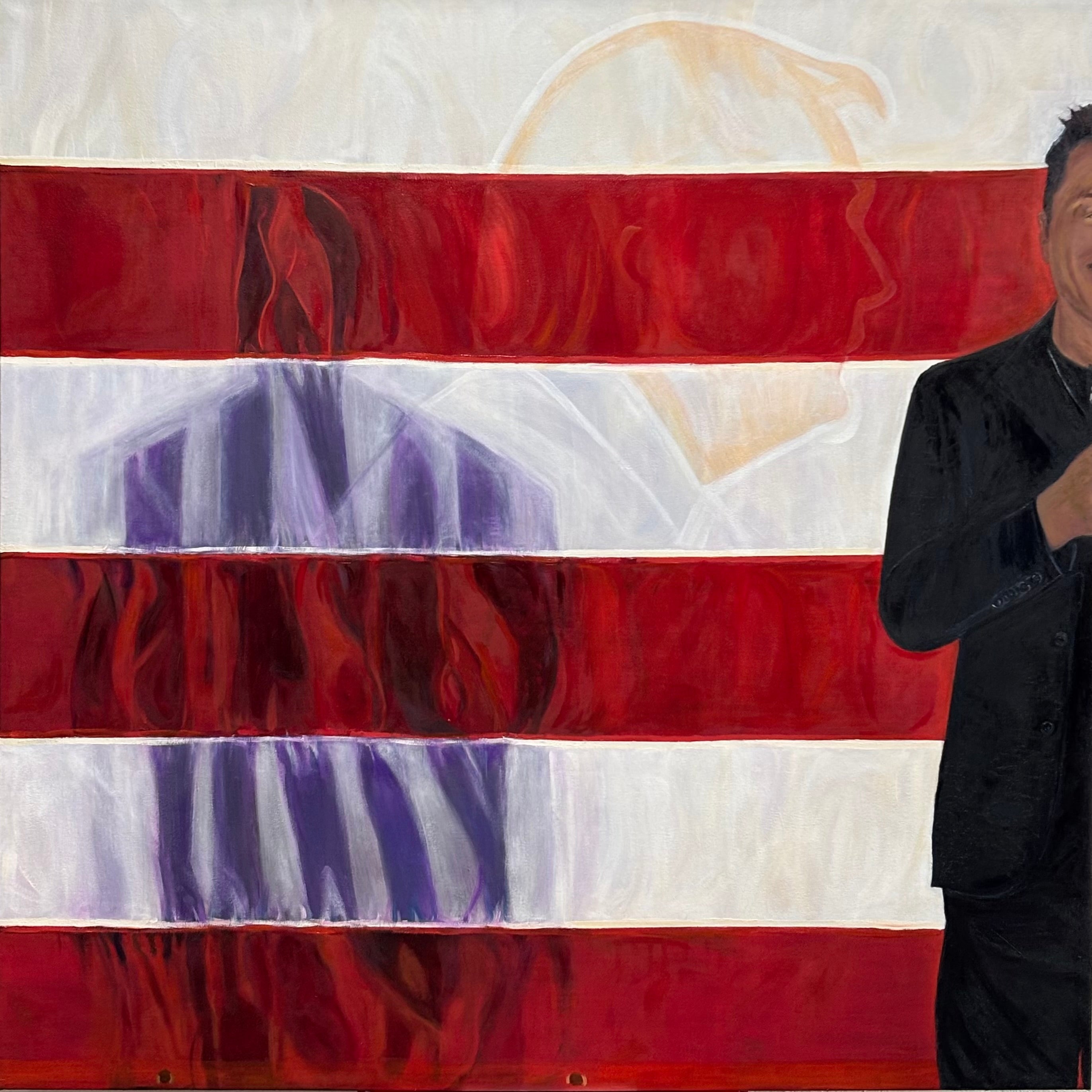 This powerful 1-of-1 original oil painting, Double Shadow of a Grand Vizier, is a striking fusion of symbolism, identity, and influence. Set against a stylized American flag backdrop, the painting features the partially revealed side profile of Elon Musk on the far right—bold, contemporary, and unmistakably present. Interwoven into the fabric of the composition is a ghostly silhouette of Donald Trump, whose image emerges subtly yet unmistakably through the red and white stripes.